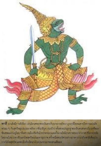พำลี เป์นลิงมีกำยสีเขียว เป์นโอรสของพระอินทร์กับนำงกำลอัจนำ ถูกฤๅษีโคดมสำปให์กำยเป์นลิง