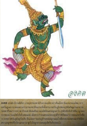 องคต เป์นลิง มีกำยสีเขียว เป์นบุตรของพำลีกับนำงมณโฑ กล์ำวคือเมื่อพำลีแย์งนำงมณโฑมำจำก