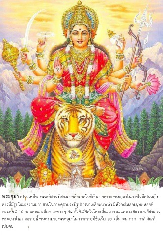 พระอุมำ เป์นมเหสีของพระอิศวร มีสองภำคคือภำคใจดีกับภำคดุร์ำย พระอุมำในภำคใจดีเป์นหญิง
