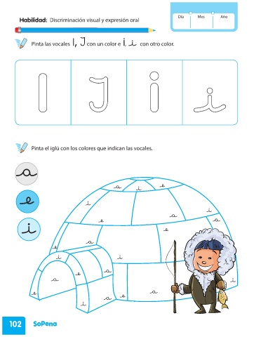 Día Mes Año Habilidad: Discriminación visual y expresión oral Pinta las vocales I, I con un color e i, i con otro color. Pinta el iglú con los colores que indican las vocales. 102 PRE KINDER_2020.indd 102 23-07-2019 13:52:50