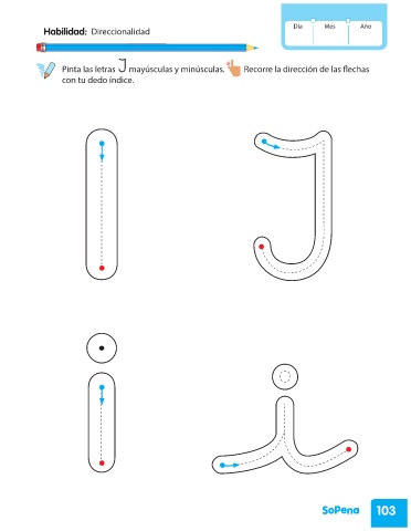 Día Mes Año Habilidad: Direccionalidad Pinta las letras I mayúsculas y minúsculas. Recorre la dirección de las flechas con tu dedo índice. 103 PRE KINDER_2020.indd 103 23-07-2019 13:52:50