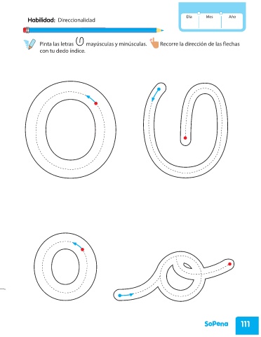 Día Mes Año Habilidad: Direccionalidad Pinta las letras O mayúsculas y minúsculas. Recorre la dirección de las flechas con tu dedo índice. 111 PRE KINDER_2020.indd 111 23-07-2019 13:52:51