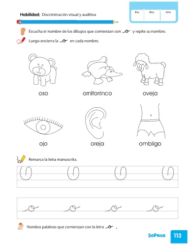 Escucha el nombre de los dibujos que comienzan con o y repite su nombre.