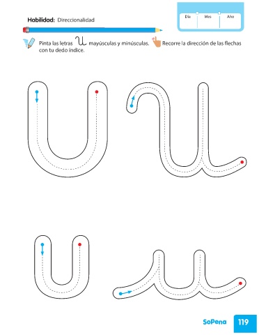 Día Mes Año Habilidad: Direccionalidad Pinta las letras U mayúsculas y minúsculas. Recorre la dirección de las flechas con tu dedo índice. 119 PRE KINDER_2020.indd 119 23-07-2019 13:52:52