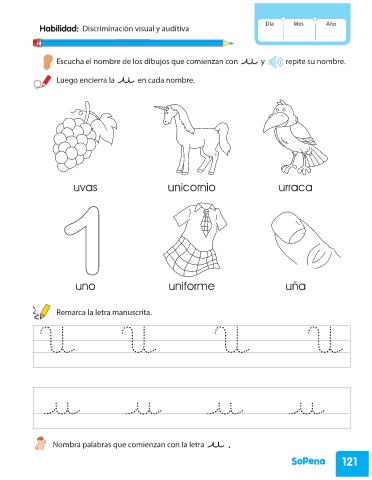 Escucha el nombre de los dibujos que comienzan con u y repite su nombre.