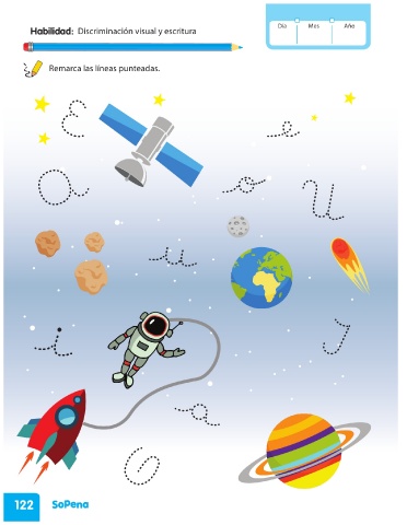 Día Mes Año Habilidad: Discriminación visual y escritura Remarca las líneas punteadas. 122 PRE KINDER_2020.indd 122 23-07-2019 13:52:52