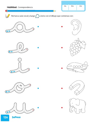 Día Mes Año Habilidad: Correspondencia Remarca cada vocal y luego únela con el dibujo que comienza con: 126 PRE KINDER_2020.indd 126 23-07-2019 13:52:53