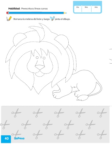 Día Mes Año Habilidad: Preescritura: líneas curvas Remarca la melena del león y luego pinta el dibujo. 40 PRE KINDER_2020.indd 40 23-07-2019 13:52:42