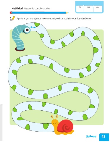 Día Mes Año Habilidad: Recorrido con obstáculos Ayuda al gusano a juntarse con su amigo el caracol sin tocar los obstáculos. 43 PRE KINDER_2020.indd 43 23-07-2019 13:52:42