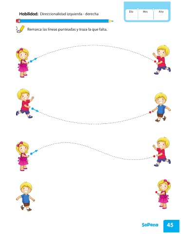 Día Mes Año Habilidad: Direccionalidad izquierda - derecha Remarca las líneas punteadas y traza la que falta. 45 PRE KINDER_2020.indd 45 23-07-2019 13:52:43