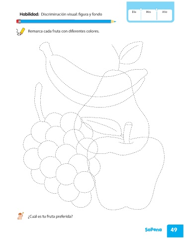 Día Mes Año Habilidad: Discriminación visual: figura y fondo Remarca cada fruta con diferentes colores. ¿Cuál es tu fruta preferida? 49 PRE KINDER_2020.indd 49 23-07-2019 13:52:43