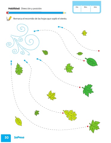Día Mes Año Habilidad: Dirección y posición Remarca el recorrido de las hojas que sopló el viento. 50 PRE KINDER_2020.indd 50 23-07-2019 13:52:43