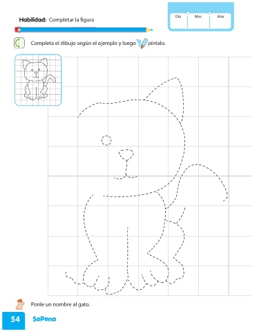 Día Mes Año Habilidad: Completar la figura Completa el dibujo según el ejemplo y luego píntalo. Ponle un nombre al gato. 54 PRE KINDER_2020.indd 54 23-07-2019 13:52:44