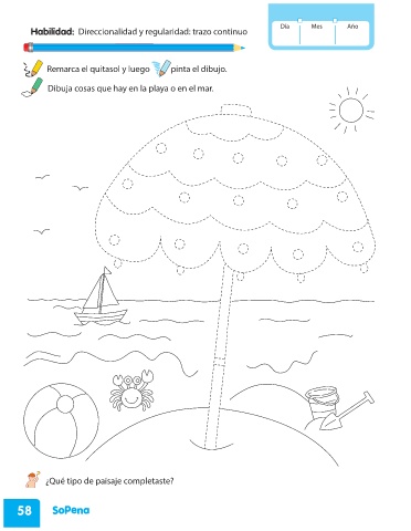 Día Mes Año Habilidad: Direccionalidad y regularidad: trazo continuo Remarca el quitasol y luego pinta el dibujo. Dibuja cosas que hay en la playa o en el mar. ¿Qué tipo de paisaje completaste? 58 PRE KINDER_2020.indd 58 23-07-2019 13:52:44