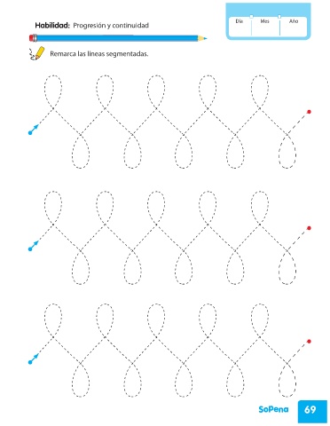 Día Mes Año Habilidad: Progresión y continuidad Remarca las líneas segmentadas. 69 PRE KINDER_2020.indd 69 23-07-2019 13:52:45
