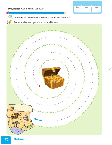 Día Mes Año Habilidad: Continuidad del trazo Descubre el tesoro escondido en el centro del laberinto. Remarca el camino para encontrar el tesoro. 72 PRE KINDER_2020.indd 72 23-07-2019 13:52:45