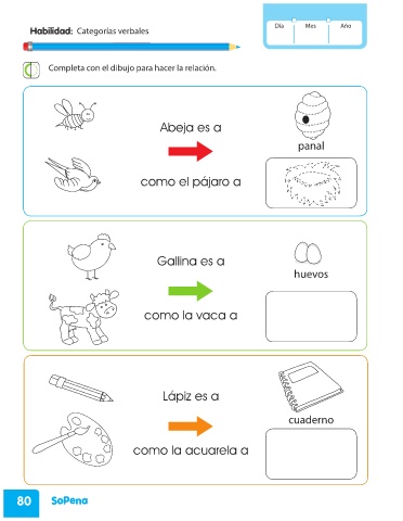 Día Mes Año Habilidad: Categorías verbales Completa con el dibujo para hacer la relación. Abeja es a panal como el pájaro a Gallina es a huevos como la vaca a Lápiz es a cuaderno como la acuarela a 80 PRE KINDER_2020.indd 80 23-07-2019 13:52:48