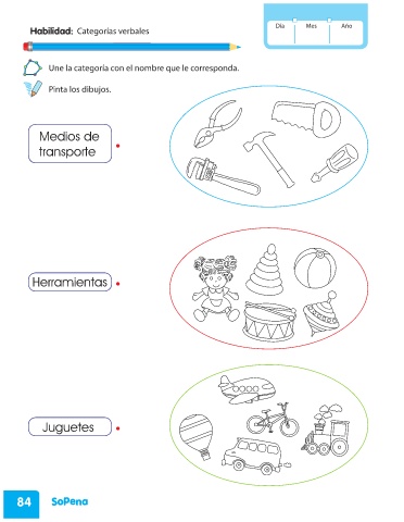 Día Mes Año Habilidad: Categorías verbales Une la categoría con el nombre que le corresponda. Pinta los dibujos. Medios de transporte Herramientas Juguetes 84 PRE KINDER_2020.indd 84 23-07-2019 13:52:48