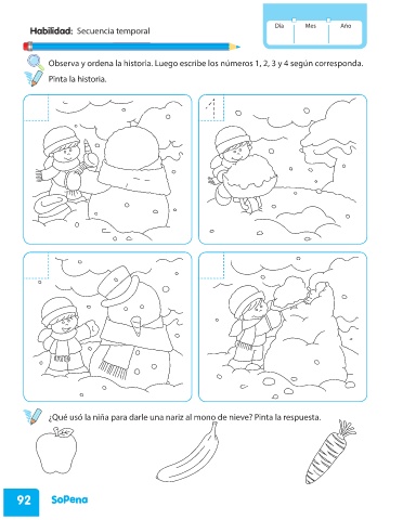 ¿Qué usó la niña para darle una nariz al mono de nieve? Pinta la respuesta.