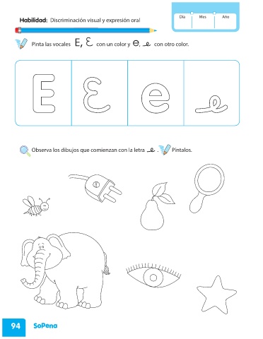 Día Mes Año Habilidad: Discriminación visual y expresión oral Pinta las vocales E, E con un color y e, e con otro color. Observa los dibujos que comienzan con la letra e . Píntalos. 94 PRE KINDER_2020.indd 94 23-07-2019 13:52:49