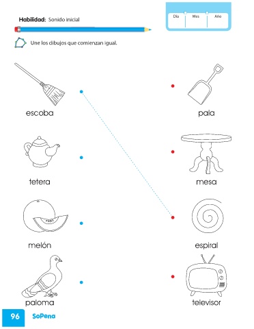 Día Mes Año Habilidad: Sonido inicial Une los dibujos que comienzan igual. escoba pala tetera mesa melón espiral paloma televisor 96 PRE KINDER_2020.indd 96 23-07-2019 13:52:50