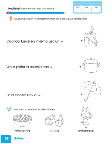 Escuchar la oración y completar uniendo con el dibujo que corresponde.