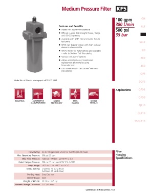 Flow Rating: Up to 100 gpm (380 L/min) for 150 SUS (32 cSt) fluids Filter