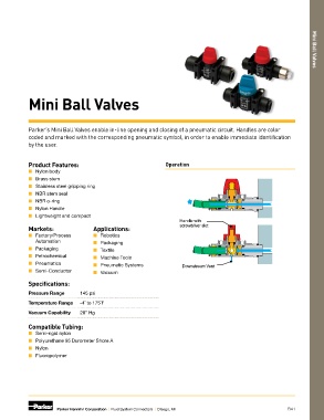 Parker’s Mini Ball Valves enable in-line opening and closing of a pneumatic circuit. Handles are color