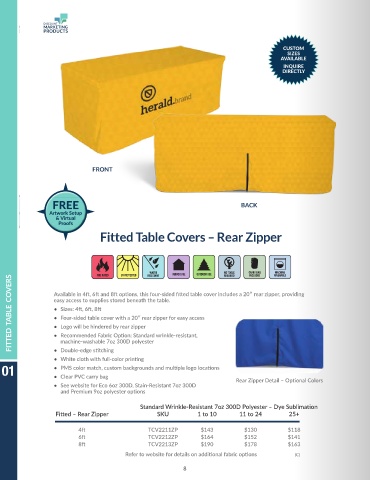 FITTED TABLE COVERS Available in 4ft, 6ft and 8ft options, this four-sided fitted table cover includes a 20″ rear zipper, providing