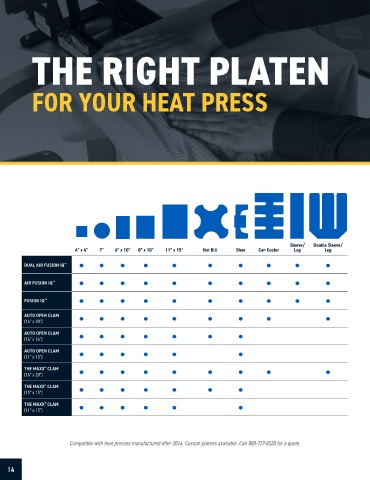 Compatible with heat presses manufactured after 2014. Custom platens available. Call 800-727-8520 for a quote.