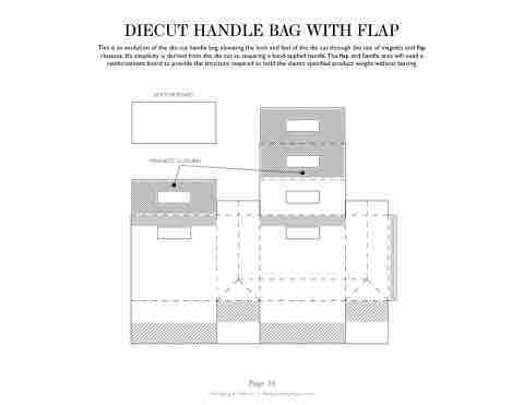 This is an evolution of the die-cut handle bag, elevating the look and feel of the die cut through the use of magnets and ap closures. It’s simplicity is derived from the die cut vs. requiring a hand-applied handle.The ap and handle area will need a reinforcement board to provide the structure required to hold the client’s speci ed product weight without tearing.