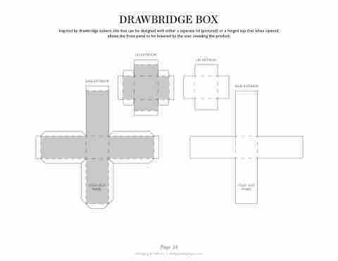 Inspired by drawbridge towers, this box can be designed with either a separate lid (pictured) or a hinged top that when opened, allows the front panel to be lowered by the user revealing the product.