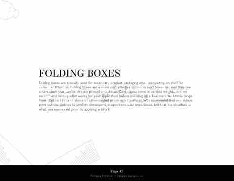 Folding boxes are typically used for secondary product packaging when competing on shelf for consumer attention. Folding boxes are a more cost effective option to rigid boxes because they use a card stock that can be directly printed and diecut. Card stocks come in various weights, and we recommend testing what works for your application before deciding on a final material. Stocks range from 10pt to 18pt and above in either coated or uncoated surfaces. We recommend that you always print out the dielines to confirm dimensions, proportions, user experience, and that the structure is what you envisioned prior to applying artwork.