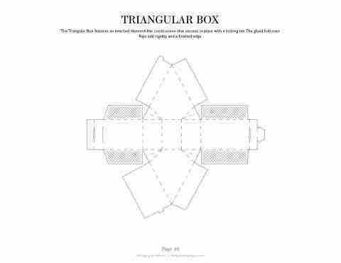TRIANGULAR BOX TheTriangular Box features an inverted diamond-like construction that secures in place with a locking tab.The glued fold-over aps add rigidity and a nished edge. Page 86 Packaging & Dielines | designpackaginginc.com
