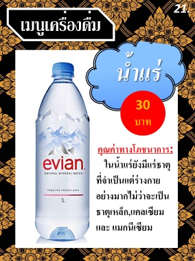 21. ่ ่ เมนูเครืองดืม น ้ำแร่ 30 บาท คุณค่าทางโภชนาการ: ในน ้าแร่ยังมีแร่ธาตุ ที่จ าเป็นแต่ร่างกาย อย่างมากไม่ว่าจะเป็น ธาตุเหล็ก,แคลเซียม และ แมกนีเซียม