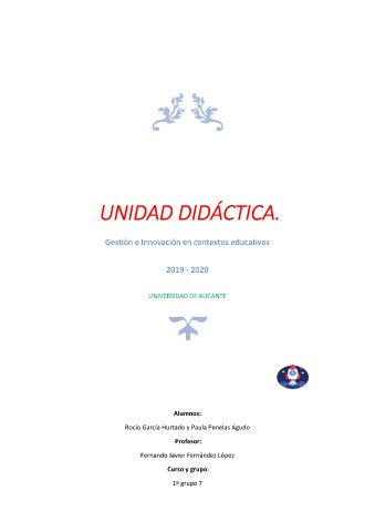 UNIDAD DIDÁCTICA. Gestión e Innovación en contextos educativos 2019 - 2020 UNIVERSIDAD DE ALICANTE Alumnos: Rocío García Hurtado y Paula Penelas Agudo Profesor: Fernando Javier Fernández López Curso y grupo: 1º grupo 7