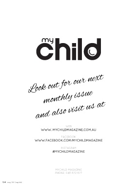Look out for our next monthly issue and also visit us at WEB WWW. MYCHILDMAGAZINE.COM.AU FACEBOOK WWW.FACEBOOK.COM/MYCHILDMAGAZINE INSTAGRAM #MYCHILDMAGAZINE MYCHILD MAGAZINE PHONE: 0411 572 877 104 may 2017 | mychild