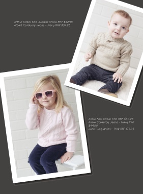 Arthur Cable Knit Jumper Stone RRP $42.95 Albert Corduroy Jeans – Navy RRP $39.95 Annie Pink Cable Knit RRP $44.95 Annie Corduroy Jeans – Navy RRP $44.95 Jose Sunglasses – Pink RRP $15.95 76 may 2017 | mychild
