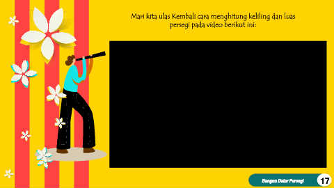 Mari kita ulas Kembali cara menghitung keliling dan luas persegi pada video berikut ini: Bangun Datar Persegi 17