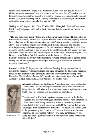 “The end came very quickly for us and although we were getting odd items of news from various sources, it came as a surprise. We now have a wireless properly installed (we’ve had one all the time although the Japs didn’t know about it – but that’s another story!) and are getting regular news bulletins. I’m very fit indeed and pass my mornings sawing and chopping up wood for our cookhouse to keep in trim! You’ve no doubt heard something of our life during the past three and a half years – anyway I can’t start to tell you now! The following are all fit and well – Geoffrey Aspdin, Jack Bennett, John Walker, Col. Lilly and most of the Foresters officers.