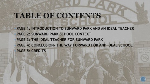 ▪ PAGE 1: INTRODUCTION TO SUNWARD PARK AND AN IDEAL TEACHER ▪ PAGE 2: SUNWARD PARK SCHOOL CONTEXT ▪ PAGE 3: THE IDEAL TEACHER FOR SUNWARD PARK ▪ PAGE 4: CONCLUSION- THE WAY FORWARD FOR AND IDEAL SCHOOL ▪ PAGE 5: CREDITS