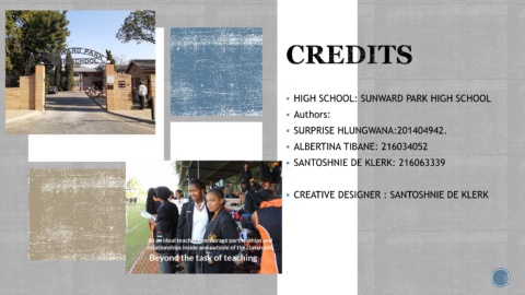 ▪ HIGH SCHOOL: SUNWARD PARK HIGH SCHOOL ▪ Authors: ▪ SURPRISE HLUNGWANA:201404942. ▪ ALBERTINA TIBANE: 216034052 ▪ SANTOSHNIE DE KLERK: 216063339 ▪ CREATIVE DESIGNER : SANTOSHNIE DE KLERK